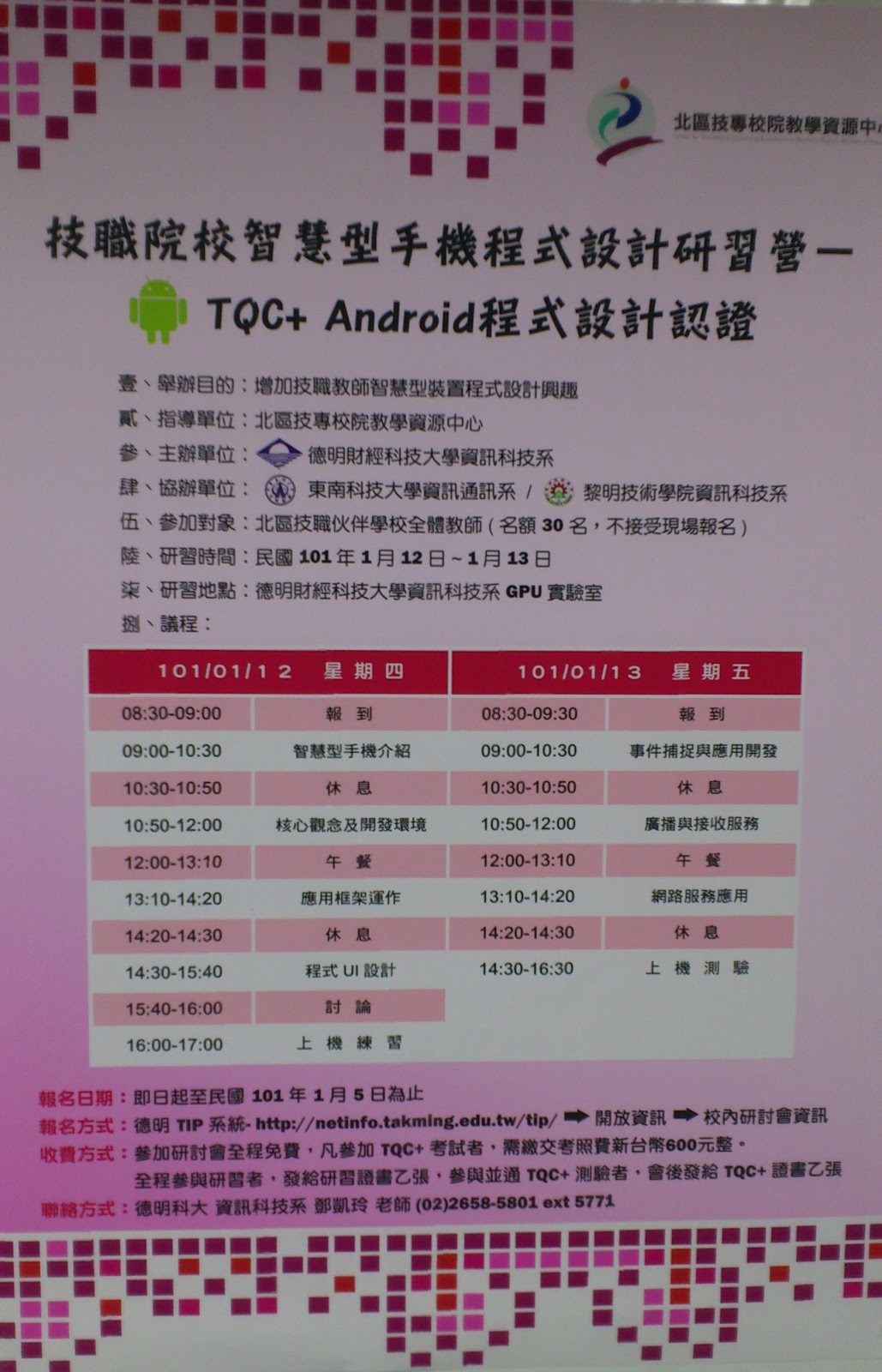 今天得北區TQC+Android研習順利結束,很高興認識好多各校的老師,有九貴致理資管的呂崇富老師,還有振傑學校的資工系老師等,尤其是九貴在學校好低調,沒說還沒有人知道他是今年證照達人比賽的第一名。