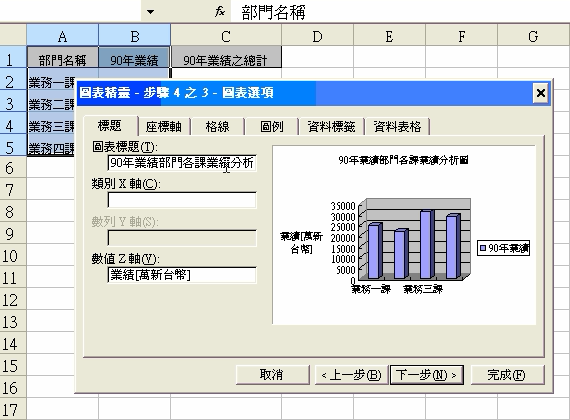Q:請利用範例檔,做出90年業務部門各課業績分析圖