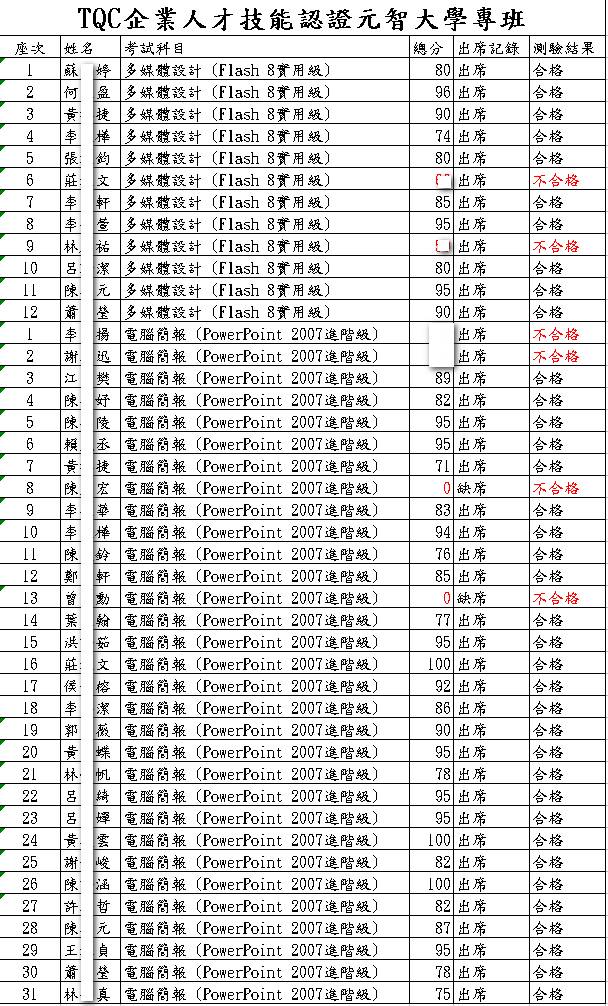 元智大學中語系電腦證照成績公佈(FLASH&PPT2007)