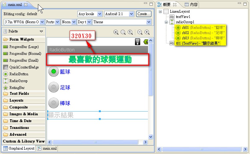 原則很簡單,就是多選一,但注意一定要用 RadioGroup 包在外面才會單選,