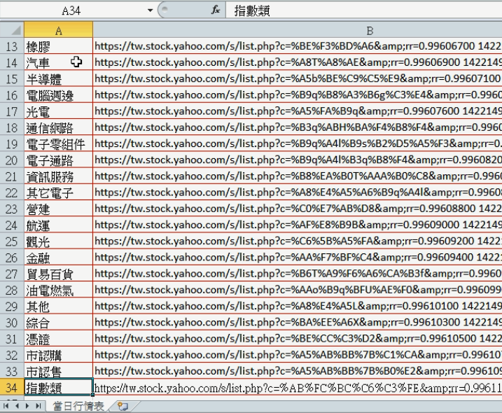 接下來要先準備好所需要的連結網址表格,欄位:類股與網址